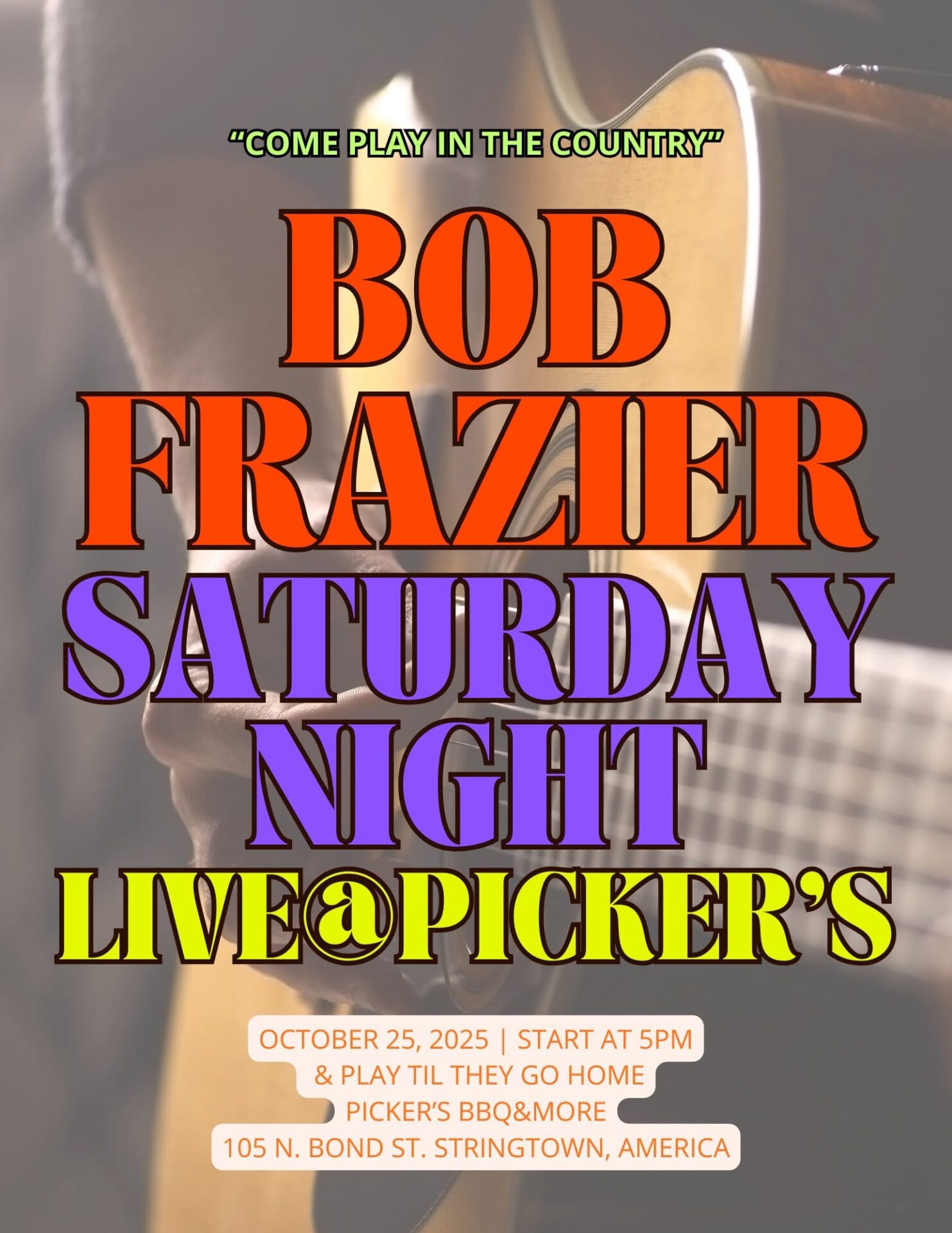 Live Music at Picker’s BBQ Atoka Area Chamber of Commerce Home Member Events Live Music at Picker’s BBQ Live Music at Picker’s BBQ October 25, 2025 , 5:00 pm Picker's BBQ105 North Bond StreetStringtown, OK 74569 Bob Frazier live at Picker’s BBQ. Music starts at 5pm.